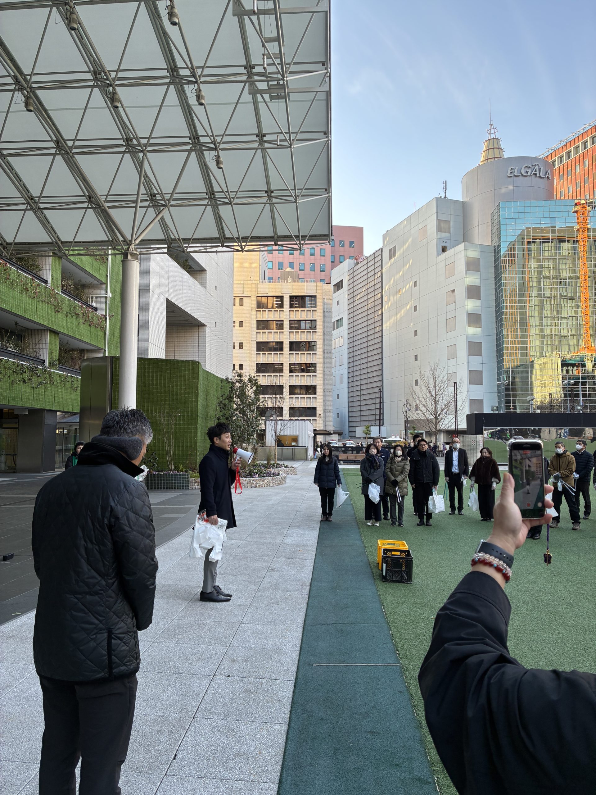朝の気温は6℃…さらにビル風が吹いて寒い中、103名の会員の皆さまにお集まりいただきました。